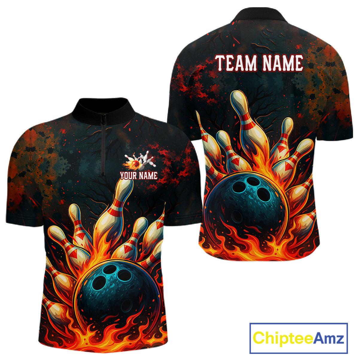 Red Flame Bowling Polo, Quarter Zip Shirts for Men Custom Team Bowling Outfit, Gift for Bowlers NQS10752