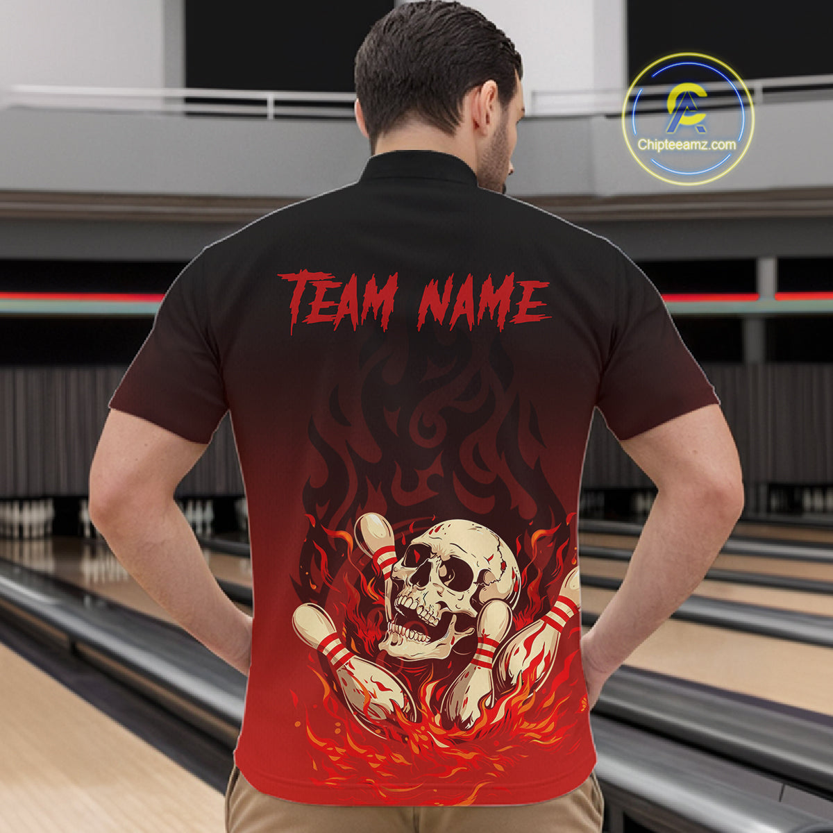 Red Skull Bowling Shirts With Flames custom quarter zip, polo team jerseys, bowling jerseys men NQS10998