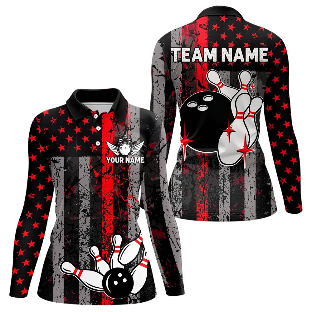 Red And Black Grunge American Flag Patriotic Bowling Shirts For Women Custom Bowling Team Jerseys TDM3696