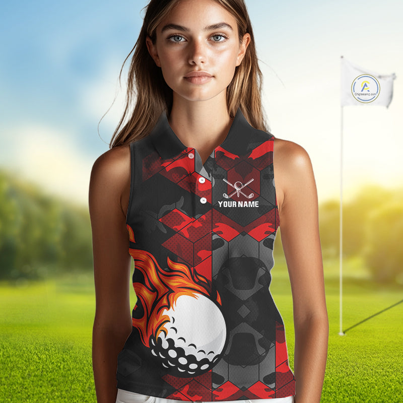 Black and Red Camo Flame Golf Ball Custom Womens Sleeveless polo shirts, golf top for ladies NQS10100