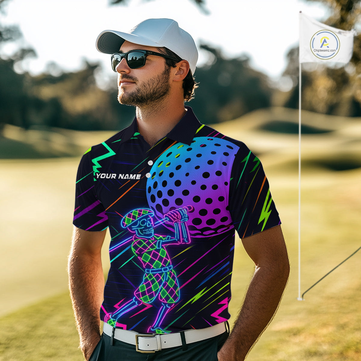 Colorful Neon skull golfer Men golf polo shirt custom golf attire for men, cool golf gifts NQS10098