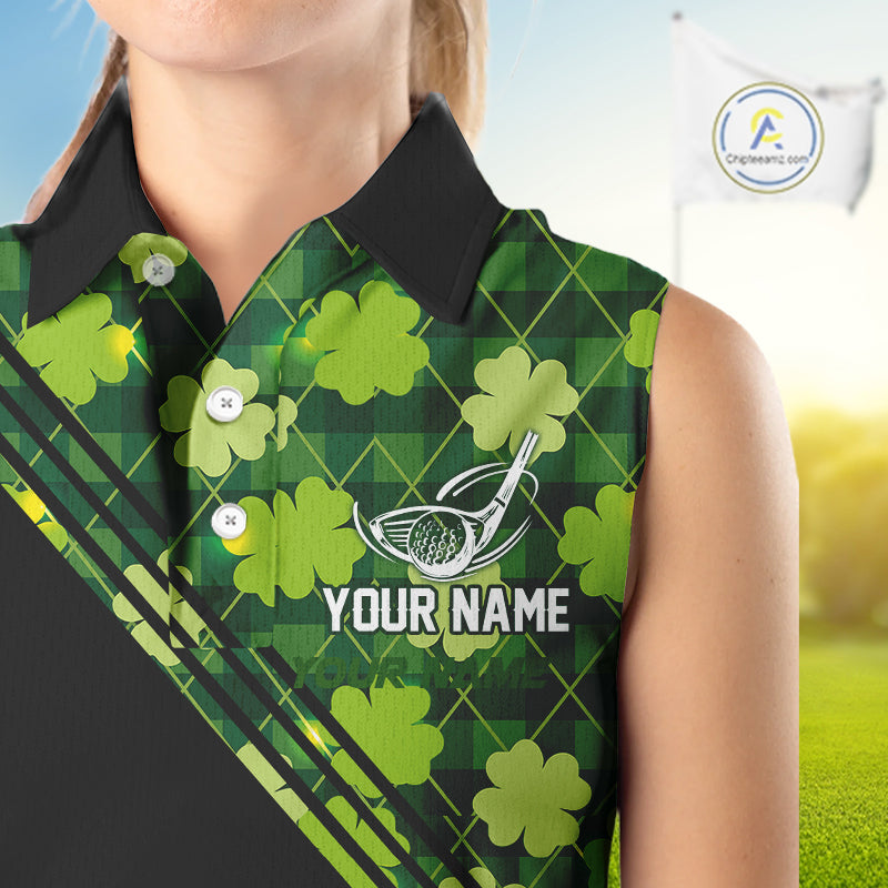 Black and Green shamrock argyle pattern Sleeveless Golf Polo Shirt Custom St Patrick ladies golf top NQS11238