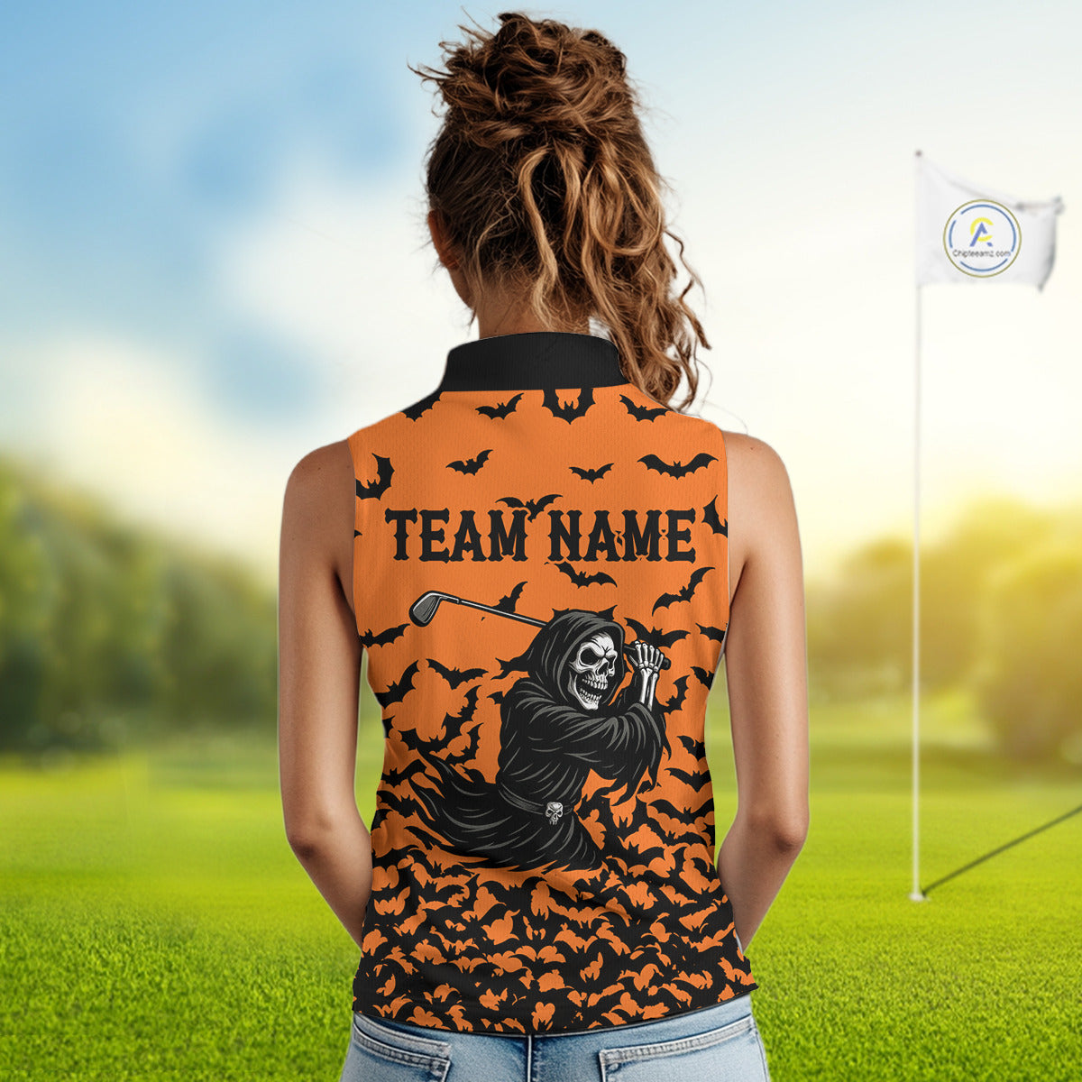 Black and Orange Bats Halloween Skull Reaper Golf Sleeveless Polo Shirt Custom ladies golf top NQS10756