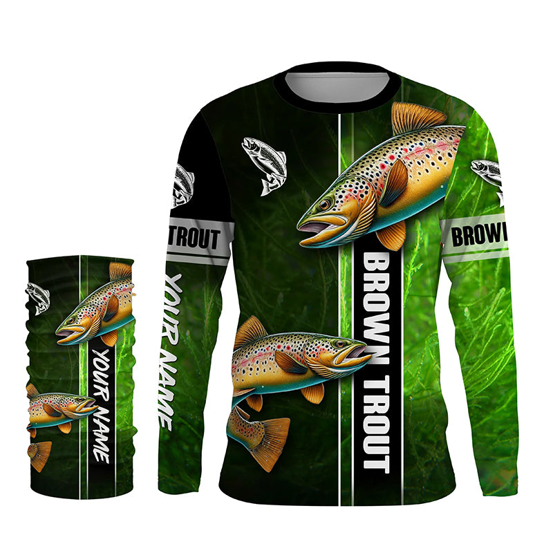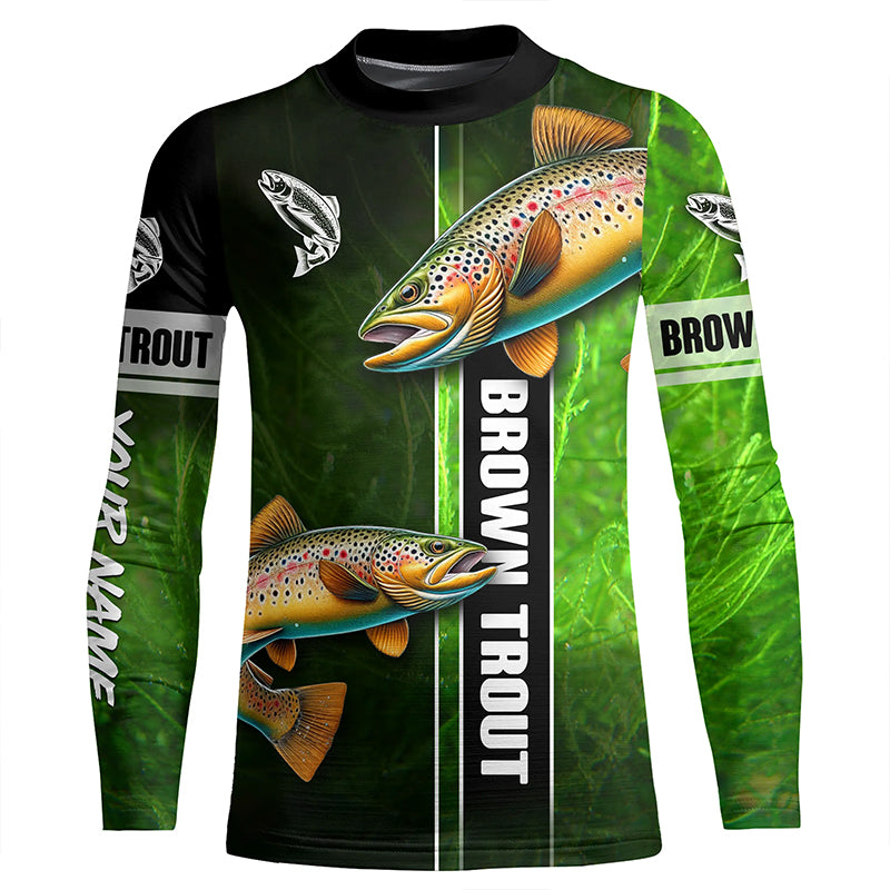 Brown trout fishing green camo Custom Long Sleeve Fishing Shirts, fishing gifts for men, women, kid NQS5808
