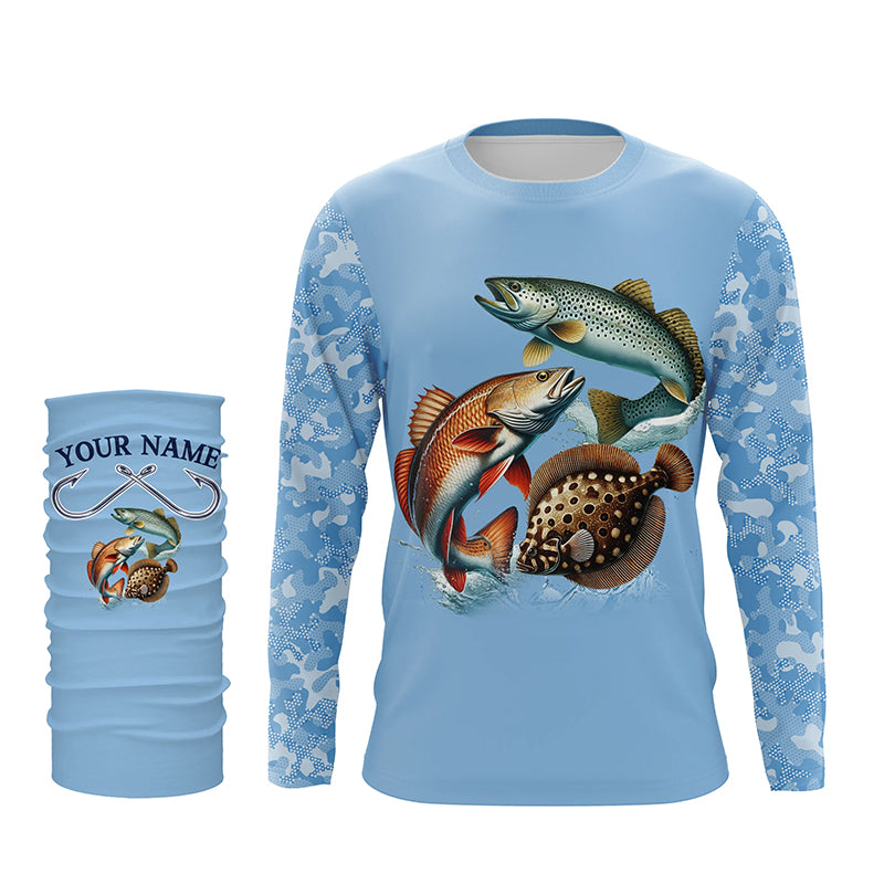 Texas slam redfish, speckled trout, flounder Texas fishing blue camo Custom performance fishing shirt NQS2621