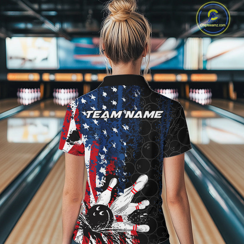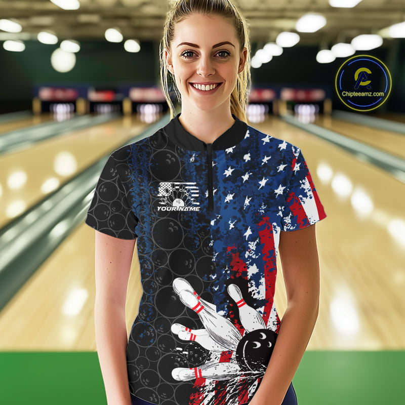 Custom Grunge Vintage American Flag Patriotic Bowling Jerseys, Women Quarter-Zip Shirt IPHW9489