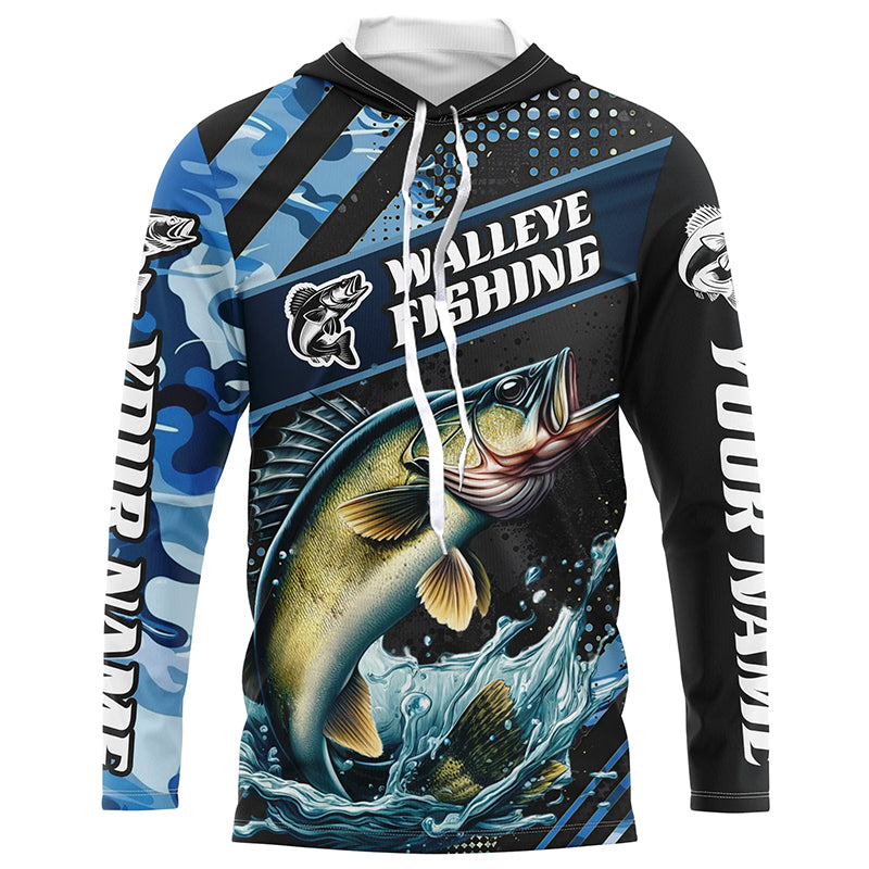 Personalized Blue Camo Walleye Fishing Jerseys, Walleye Long Sleeve Tournament Fishing Shirts IPHW6330