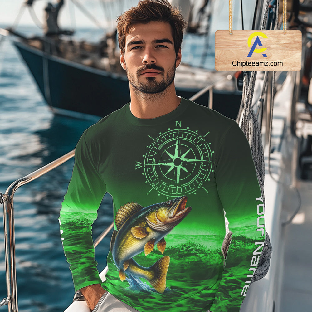 Personalized Walleye Green Performance Fishing Shirts, compass Walleye fishing tournament Shirts NQS10236