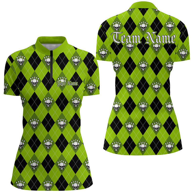 Green Argyle Pattern Custom Skull Bowling Shirts For Women, Halloween Outfit Bowling IPHW7299