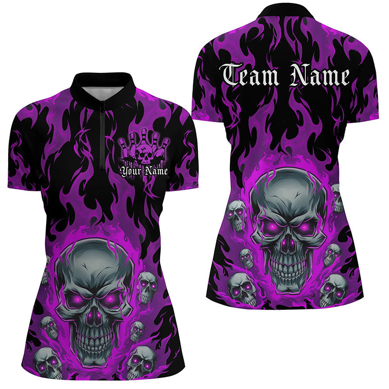 Custom Purple Flame Skull Bowling Shirts For Women, Halloween Bowling Team Outfits Uniform IPHW7385