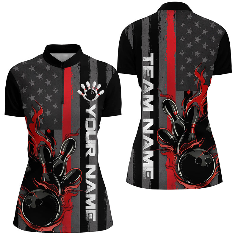 Red Line American Flag Custom Patriotic Flame Ladies Bowling Shirts, Firefighter Bowling IPHW7592