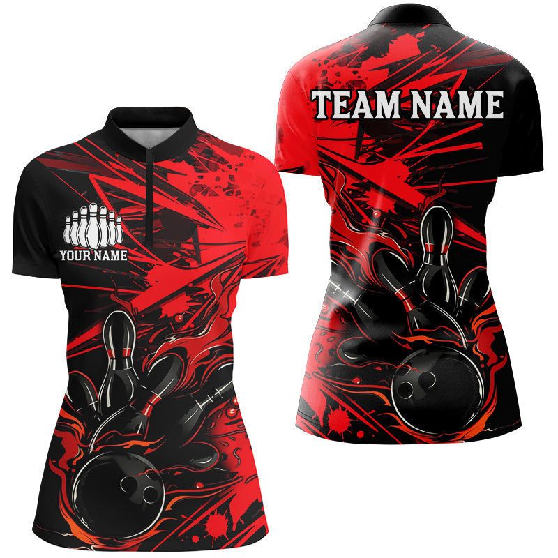 Black And Red Custom Flame Bowling Shirts For Women, Bowling Team Uniform Bowler Outfits IPHW7692