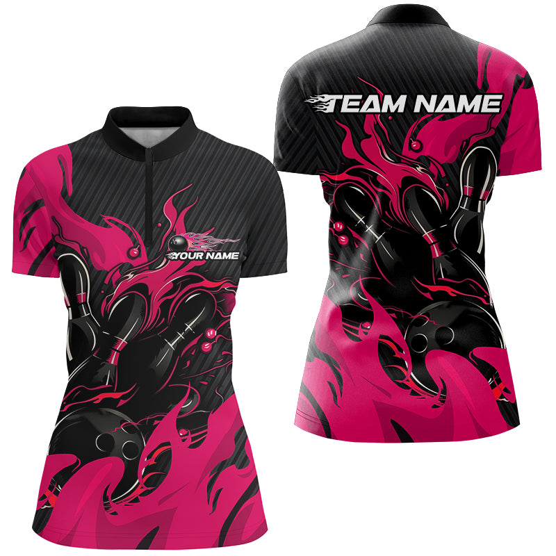 Black And Pink Custom Flame Bowling Shirts For Women, Bowling League Shirts Team Uniform IPHW7697