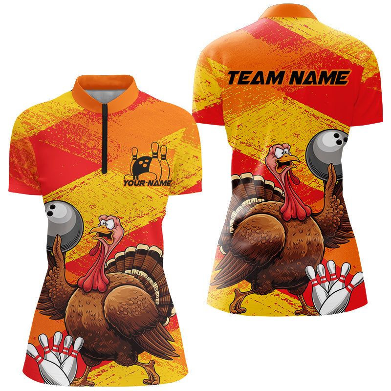 Orange And Yellow Custom Funny Turkey Ladies Bowling Shirts, Thanksgiving Bowling Outfits IPHW7882