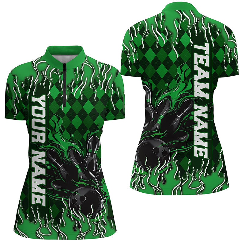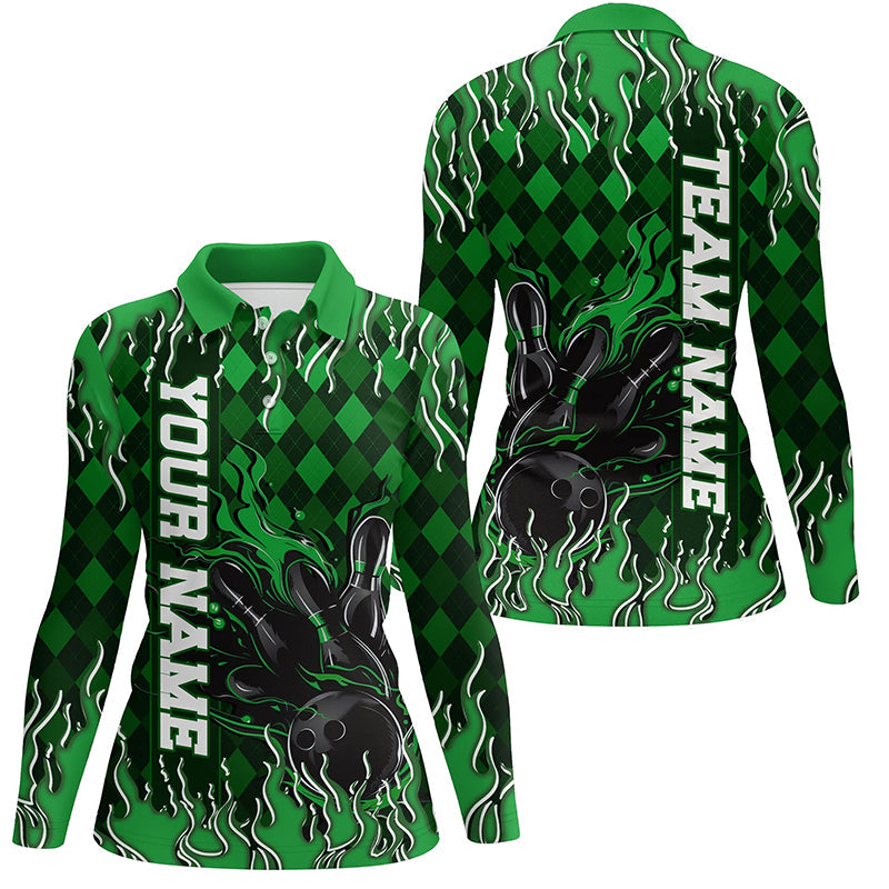 Green Argyle Pattern Custom Flame Strike Bowling Shirts For Women, Bowling Team Outfit IPHW7899