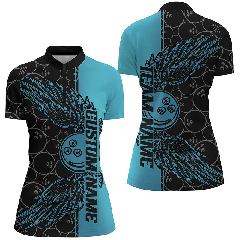 Black And Teal Blue Custom Bowling Ball And Wings Bowling Shirts For Women, Bowling Team Uniform IPHW7929