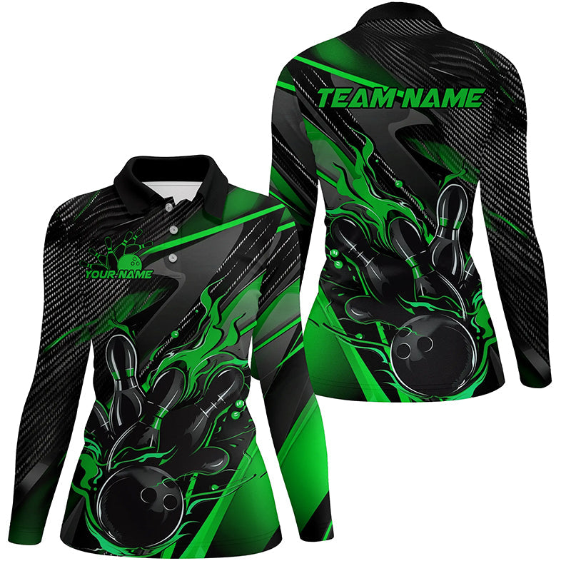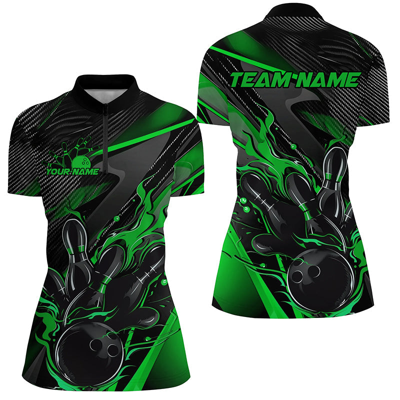 Black And Green Custom Flame Bowling Shirts For Women, Fire Bowling Team Shirt Bowler Jersey IPHW7934