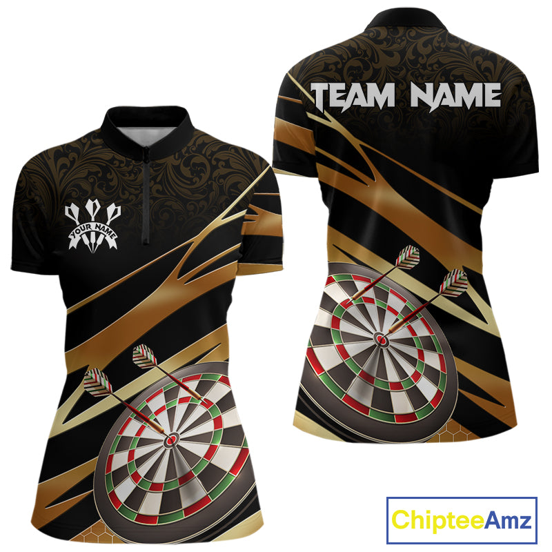 Black And Gold Dart Shirts For Women Custom 3D Dartboard Jersey, Darts Team Polo & Quarter Zip TDM4094