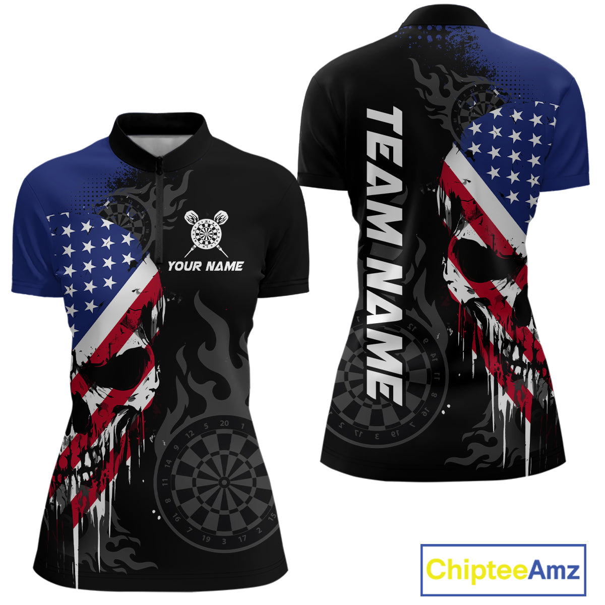 Grunge American Flag Skull Darts Shirt For Women Custom Patriotic Darts Team Jerseys Polo & 1/4 Zip TDM4197