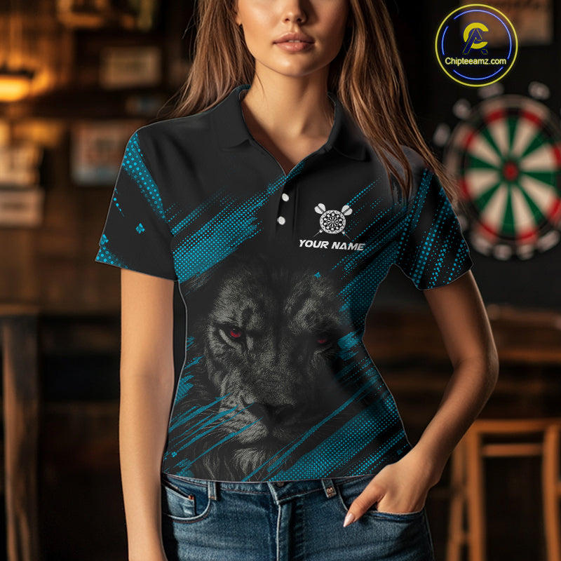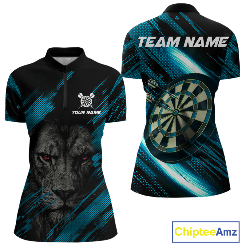 Personalized Cyan & Black Lion Darts Shirt For Women Custom Light Dartboard Jersey Polo & 1/4 Zip TDM4335
