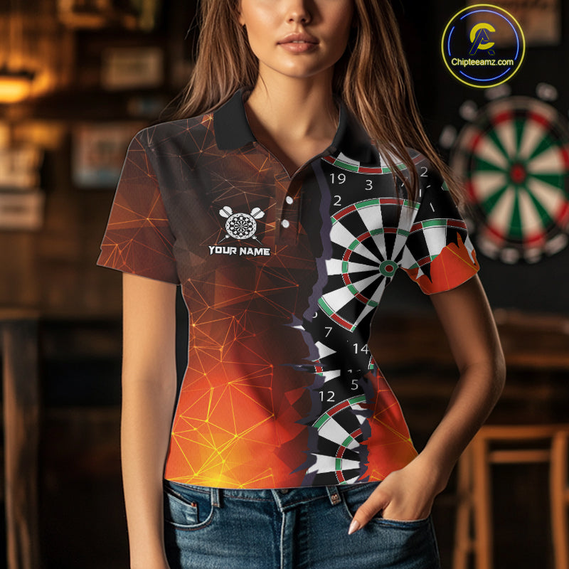 Personalized Fiery Orange Dartboard Crack Darts Shirt For Women, Funny Darts Jersey Polo & 1/4 Zip TDM4449