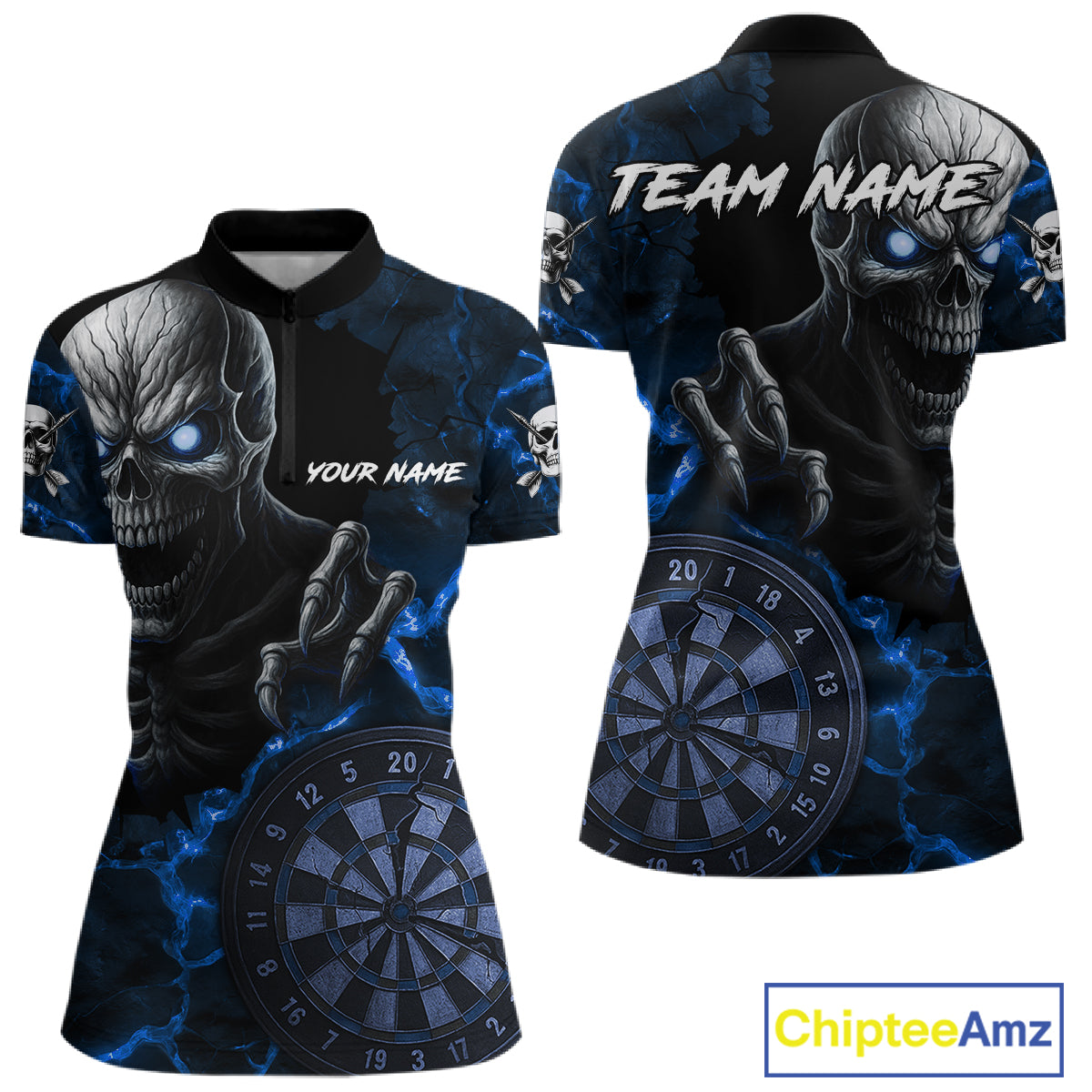 Personalized Skull Darts Polo & Quarter Zip For Women Custom Fire Darts League Team Jersey |Blue TDM4719
