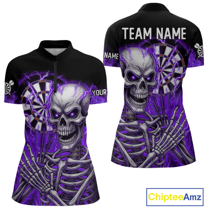 Purple Flaming Lightning Skeleton Darts Shirt For Women Custom Skull Dart Jersey Team Polo & 1/4 Zip TDM4739