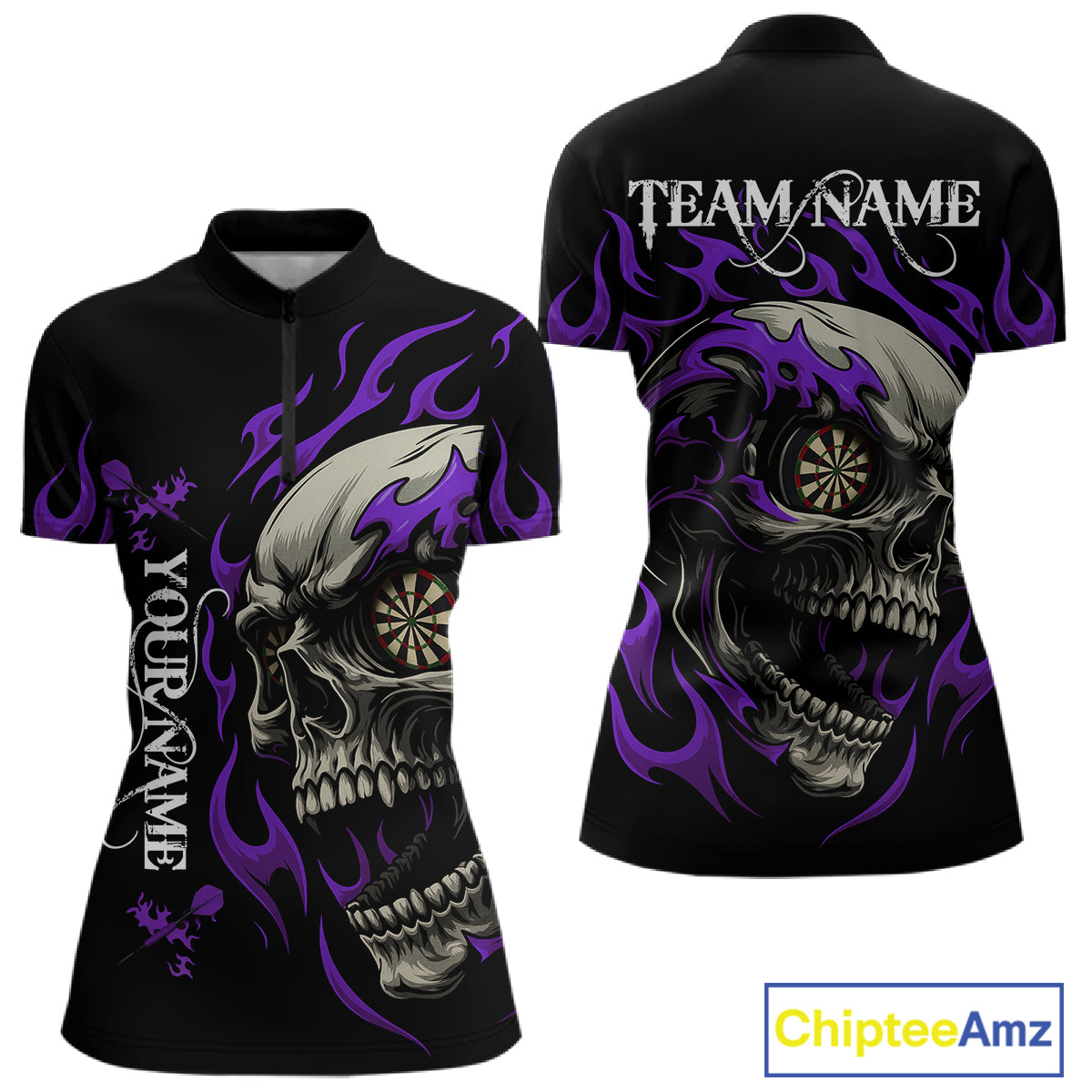 Personalized Purple Flaming Skull Darts Shirt For Women Custom Darts Jersey Team Polo & 1/4 Zip TDM4764