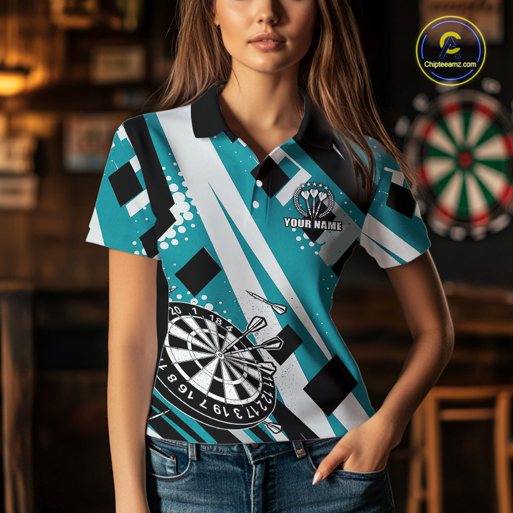Custom Turquoise Geometric Darts Polo & Quarter Zip For Women, Darts Team Jersey Outfit TDM5027