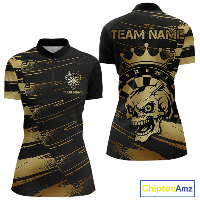 Black And Gold Funny Skull Crown Darts Shirt For Women Custom Dart Jerseys Team Polo & Quarter Zip TDM5168
