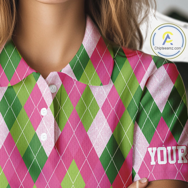 Pink and Green argyle pattern Women golf polo shirt custom golf jerseys, personalized golf apparel NQS10408