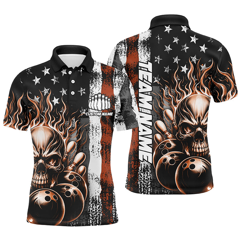 Personalized Multi-Color Thin Line American Flag Skull Bowling Team Shirts, Patriotic Flame Bowling Jerseys IPHW5928