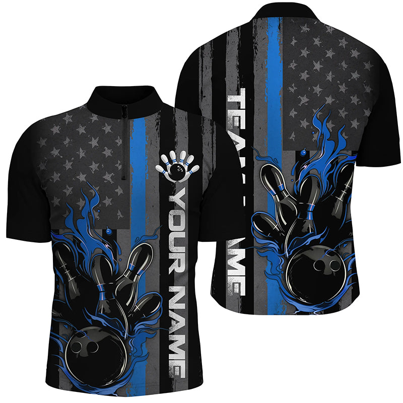 Blue Line American Flag Custom Patriotic Flame Bowling Shirts For Men, Support Bowling Shirt IPHW7593