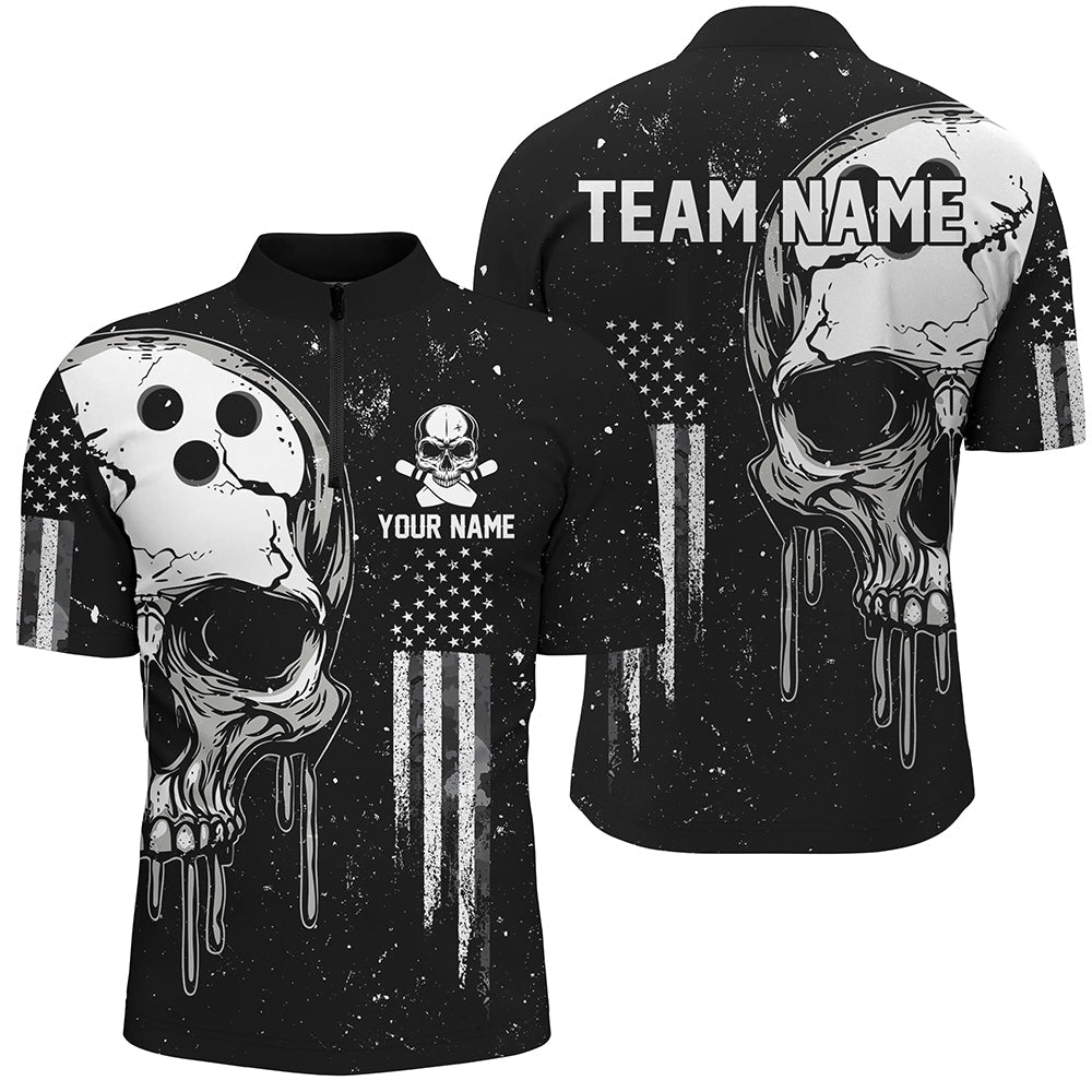 Personalized Black and White grunge American Flag Skull Bowling Team Shirts, Patriotic Bowling Jerseys NQS8601