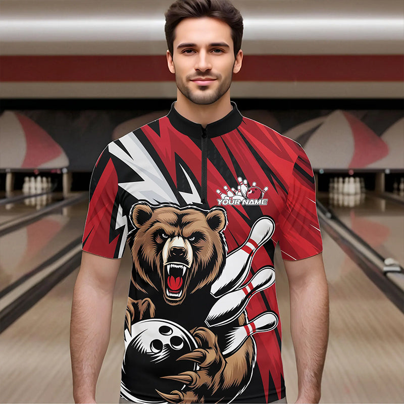 Personalized Bear Bowling Quarter-Zip Shirts For Men, Bear Bowling Team Red Bowling League Shirt IPHW8827