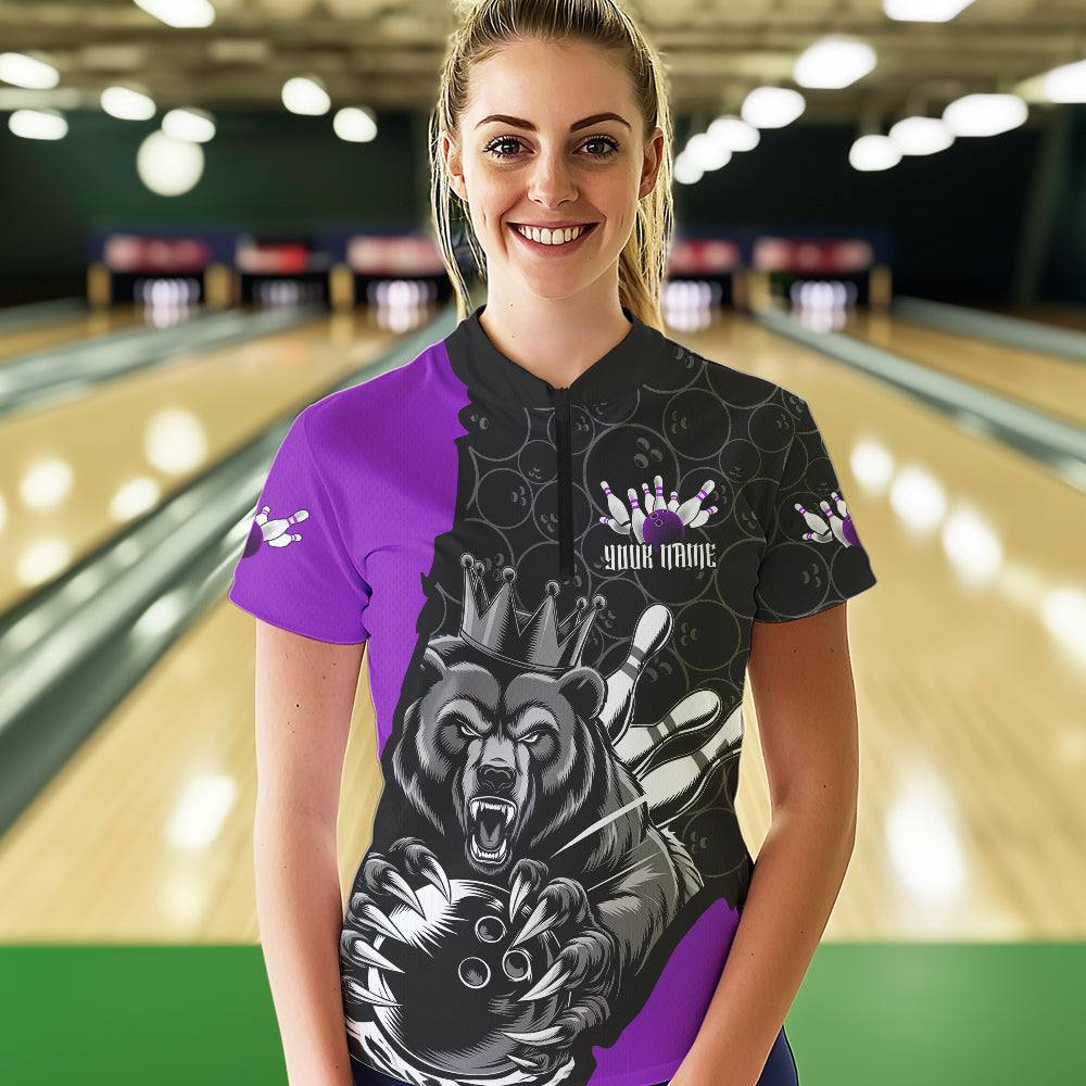 Black And Purple Custom Bear Bowling Queen Women Quarter-Zip Shirt, Bowling Team Uniform IPHW8836