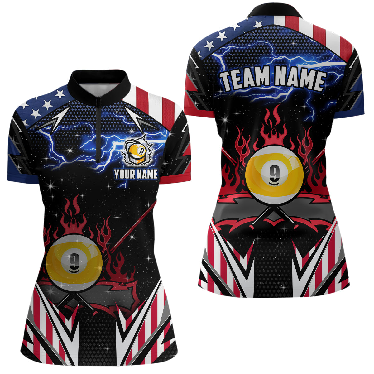 9 Ball Pool Billiard Jerseys Custom Lightning American Flag Women Billiard Shirts, 9 Ball Team Shirts TDM2867