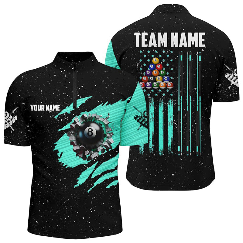 Customized Grunge American Flag 8 Ball Pool Men Billiard Polo Shirts, Pool Player Shirts |Turquoise TDM3172