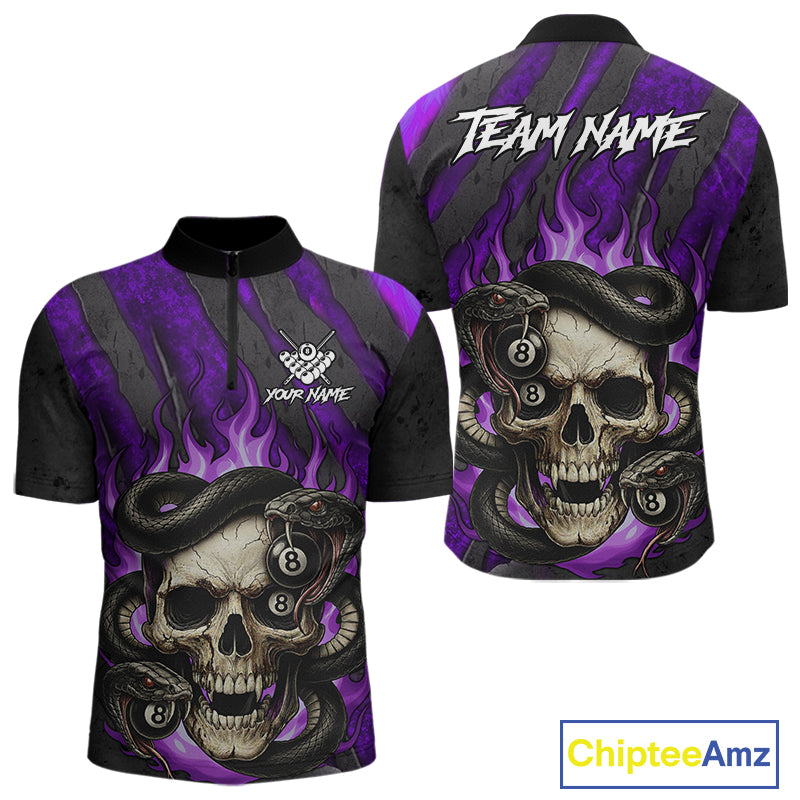 Personalized Skull And Snakes Flame Billiard Shirt For Men Custom 8 Ball Pool Team Jersey |Purple TDM5086