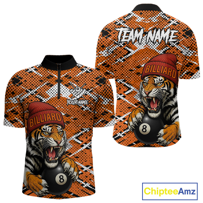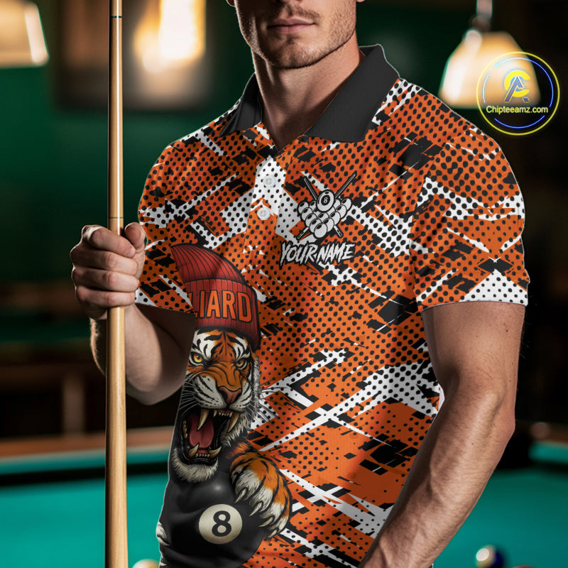 Personalized Orange Black Grunge Tiger Billiard Shirt For Men Custom 8 Ball Pool Team Jersey TDM5100