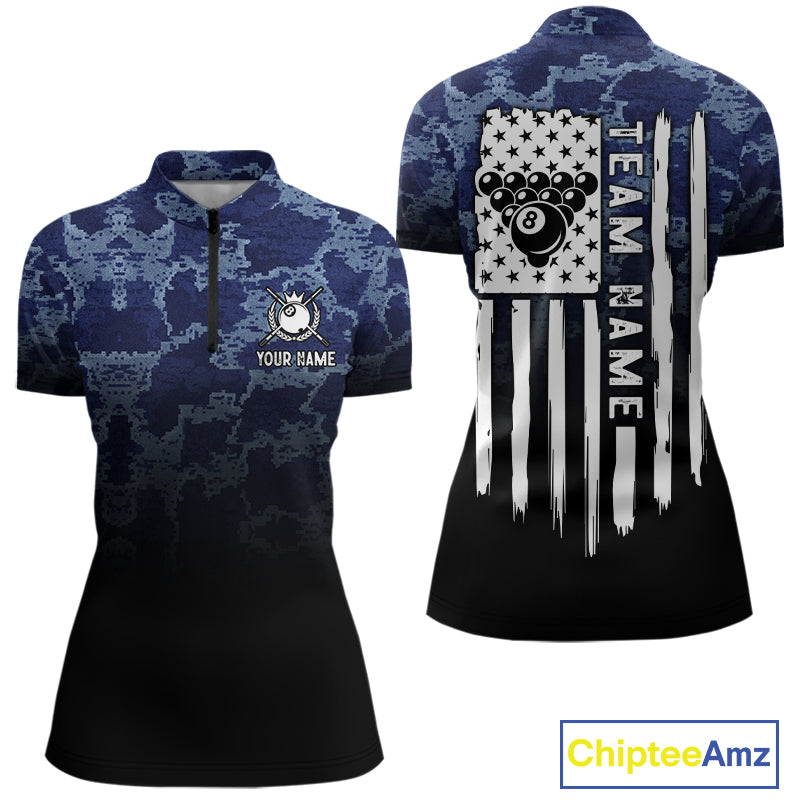Black And Blue Camo American Flag 8 Ball Billiard Shirt For Women Custom Patriotic Pool Team Jersey TDM5037