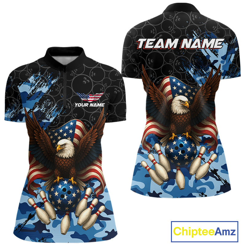 Black and Blue Camo American Flag Eagle Bowling Shirt For Women Custom Patriotic Team Bowling Jersey NQS10644