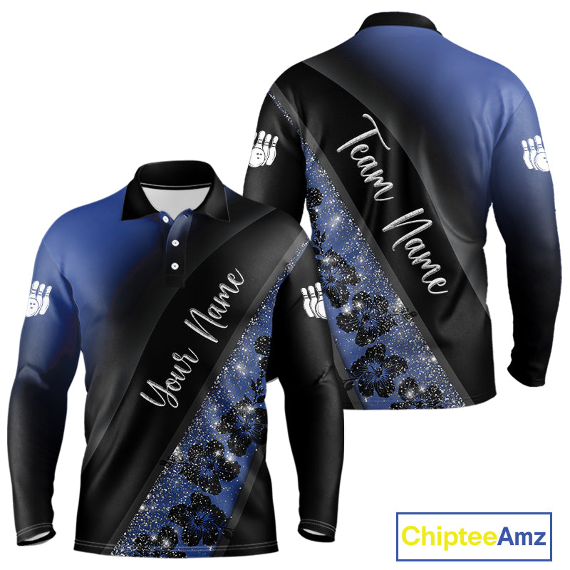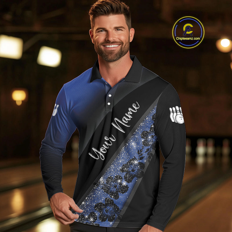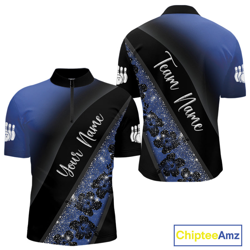 Black and Blue Glitter Flower Bowling Polo, Quarter Zip Shirt for Men Custom Bowling Team Jerseys NQS10383