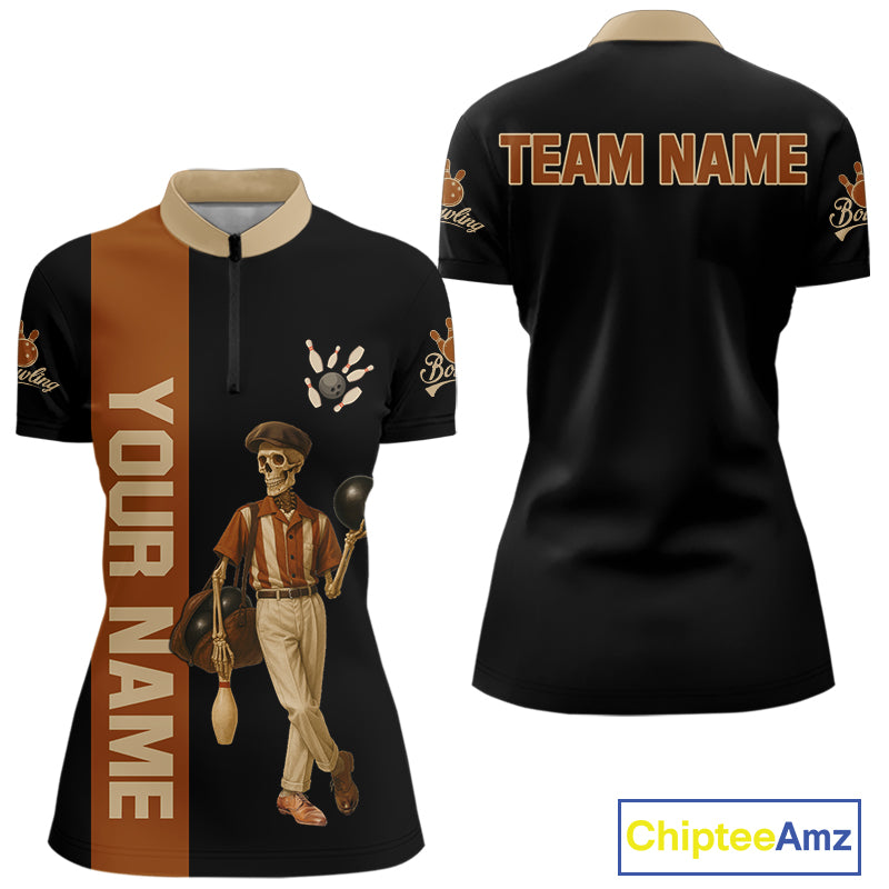 Black and Brown Skull Retro Bowling Polo, Quarter Zip Shirts For Women Custom Team Bowling Jersey NQS10859