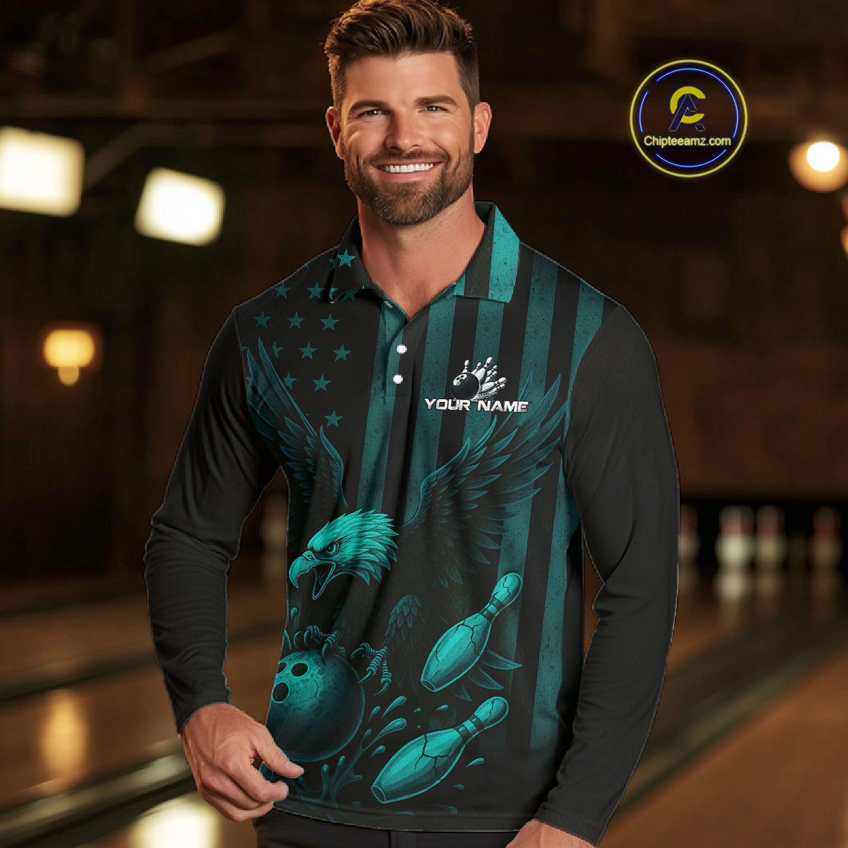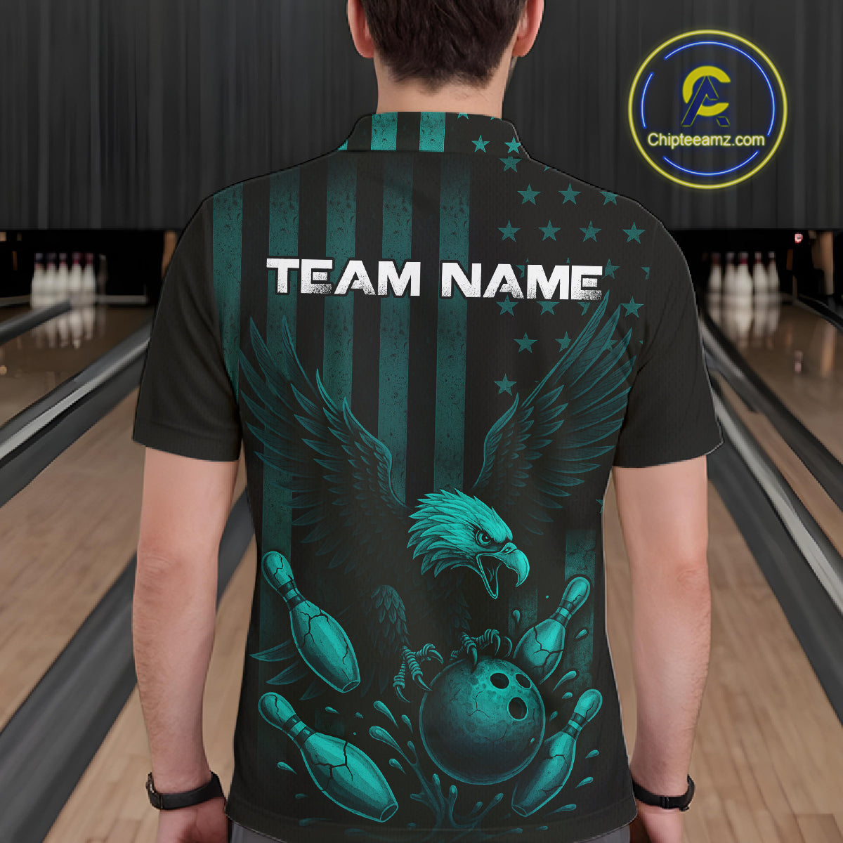 Black and Cyan Blue American Flag Eagle Bowling Shirt For Mens Custom Patriotic Team bowling jerseys NQS10478