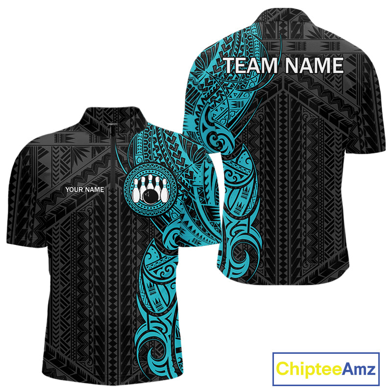 Black and Cyan Blue Tribal pattern Men Bowling Shirt Custom Bowling outfit men Team bowling jersey NQS10649