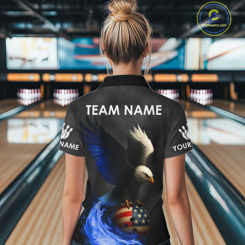 Black and White Eagle Blue Flame American Flag Bowling Shirt For Women Custom Team Bowling Jersey NQS10857