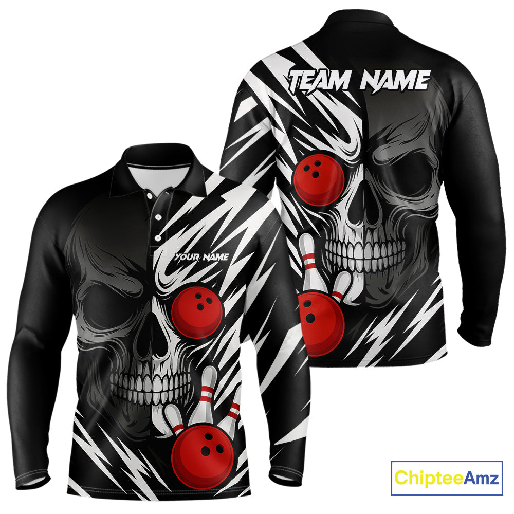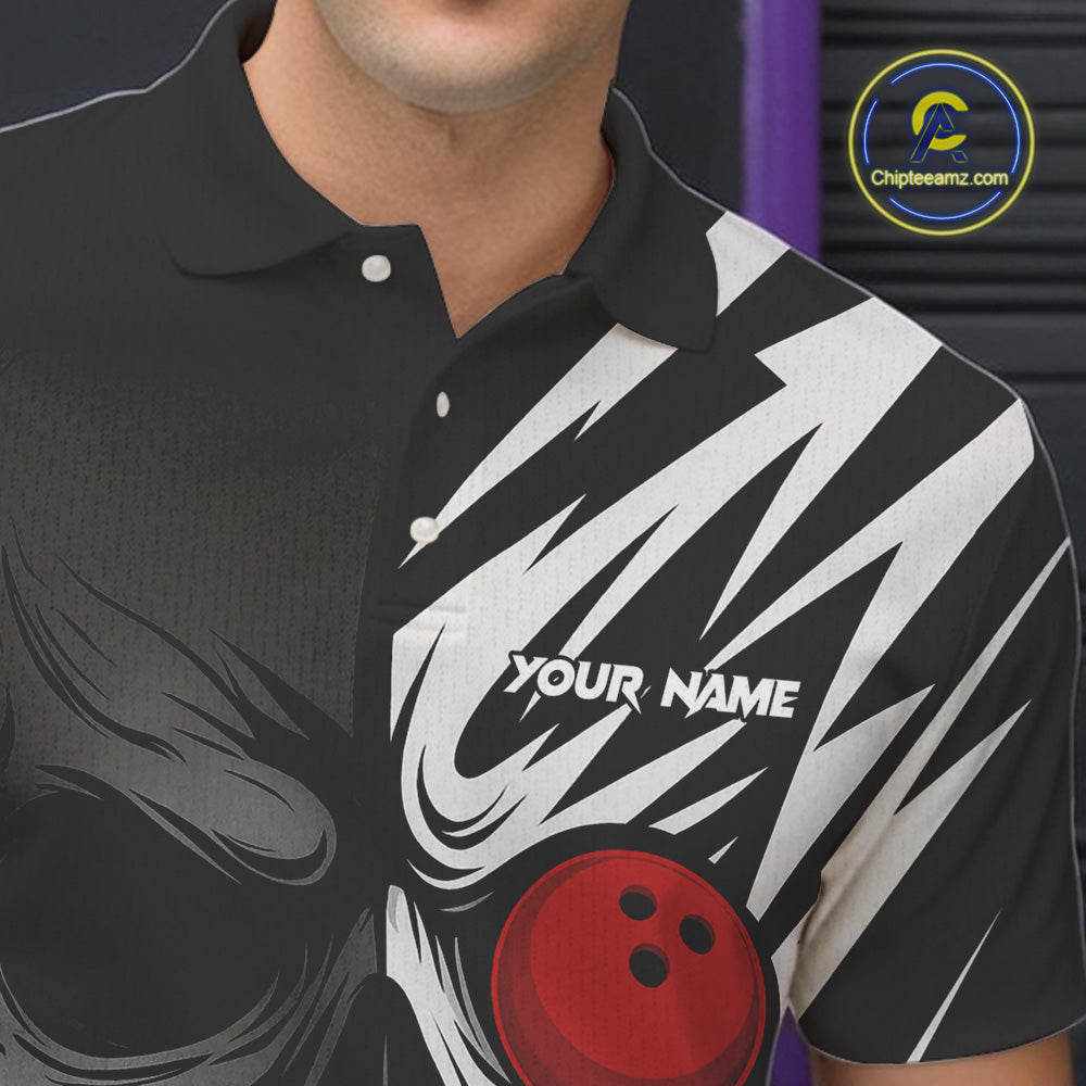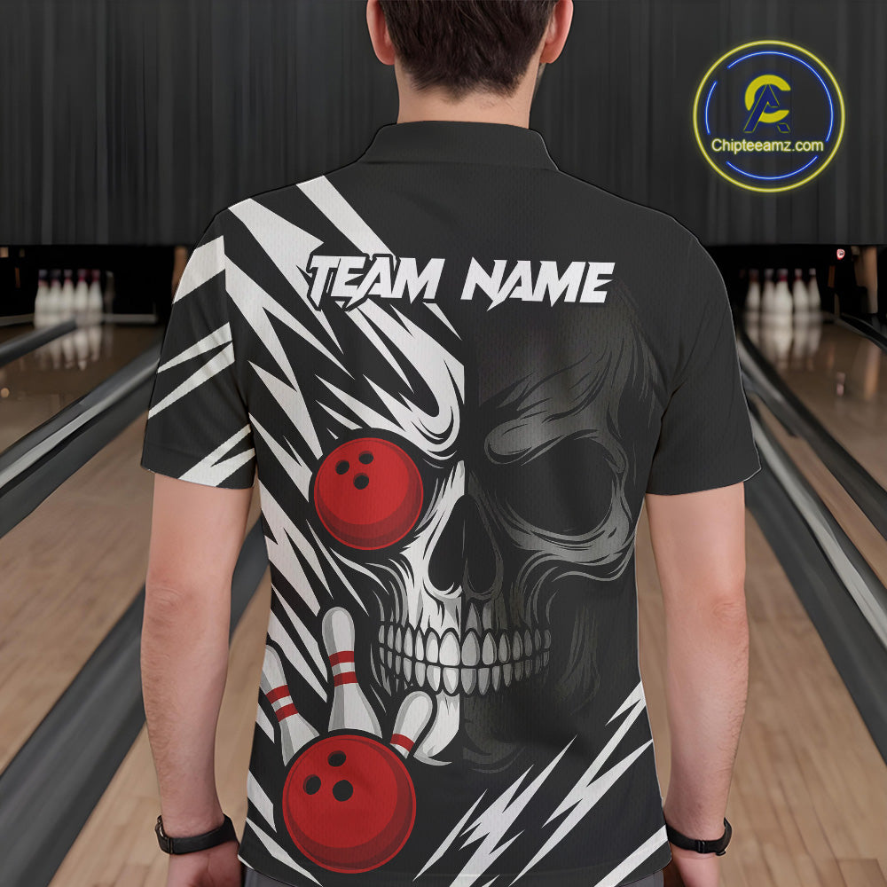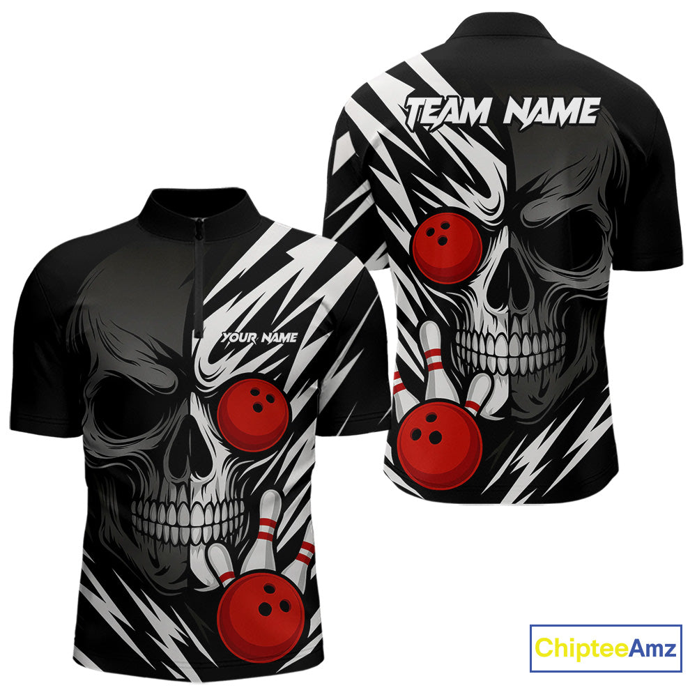Black and White Skull Bowling Polo, Quarter Zip shirts for Men Custom Skull Team Bowling Jerseys NQS10261