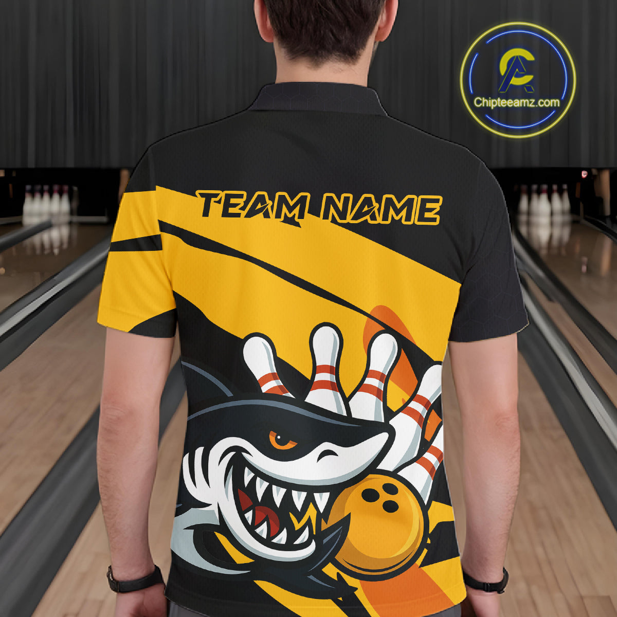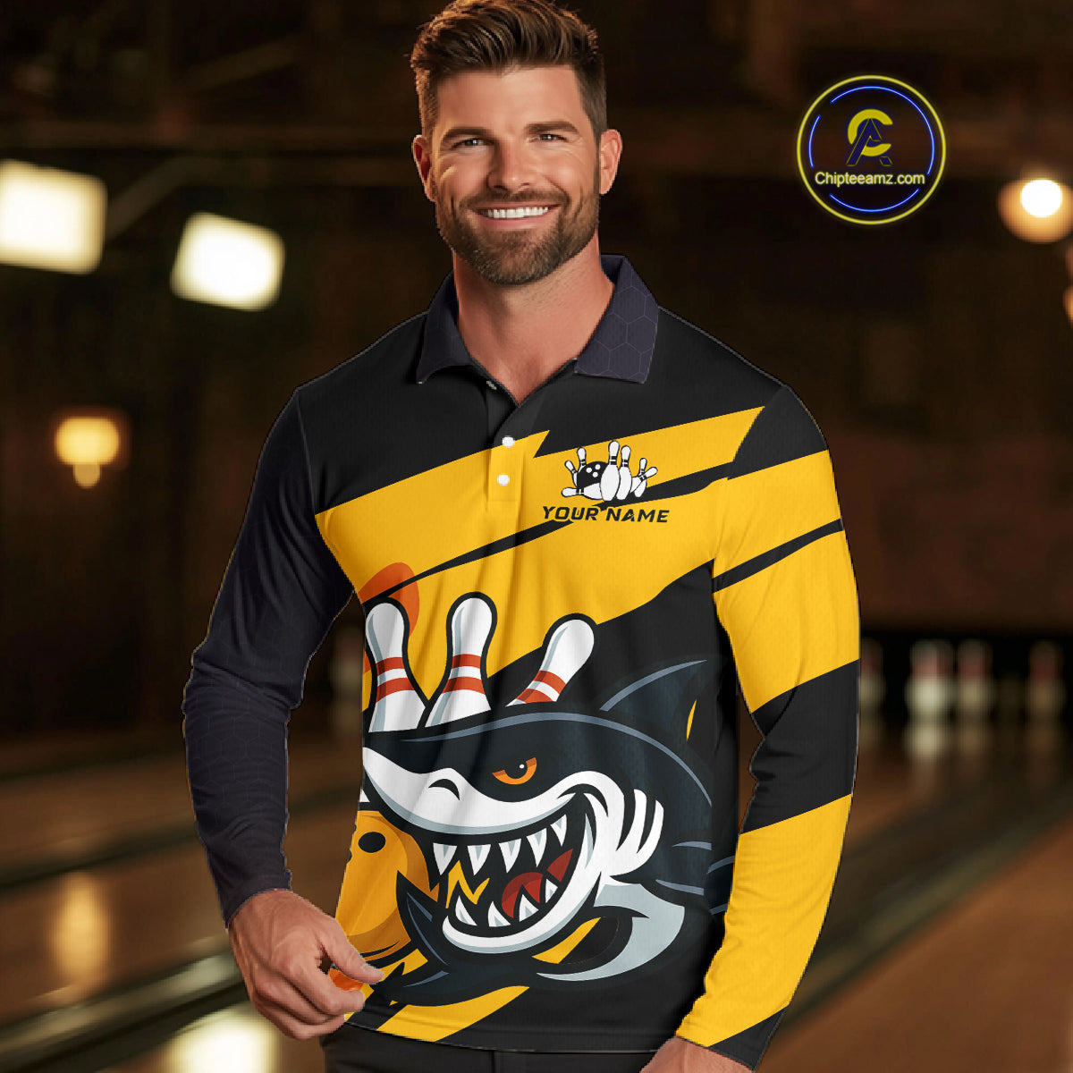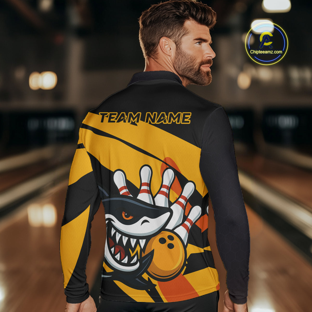 Black and yellow shark Bowling polo, quarter zip shirt for men custom Shark Bowling team league shirt NQS10393