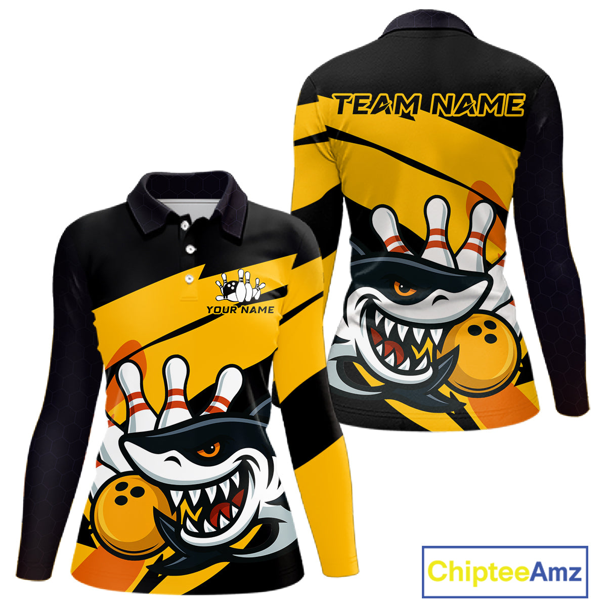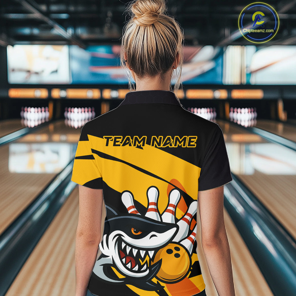 Black and yellow shark Women Bowling polo, quarter zip shirt custom Shark Bowling team league shirt NQS10393